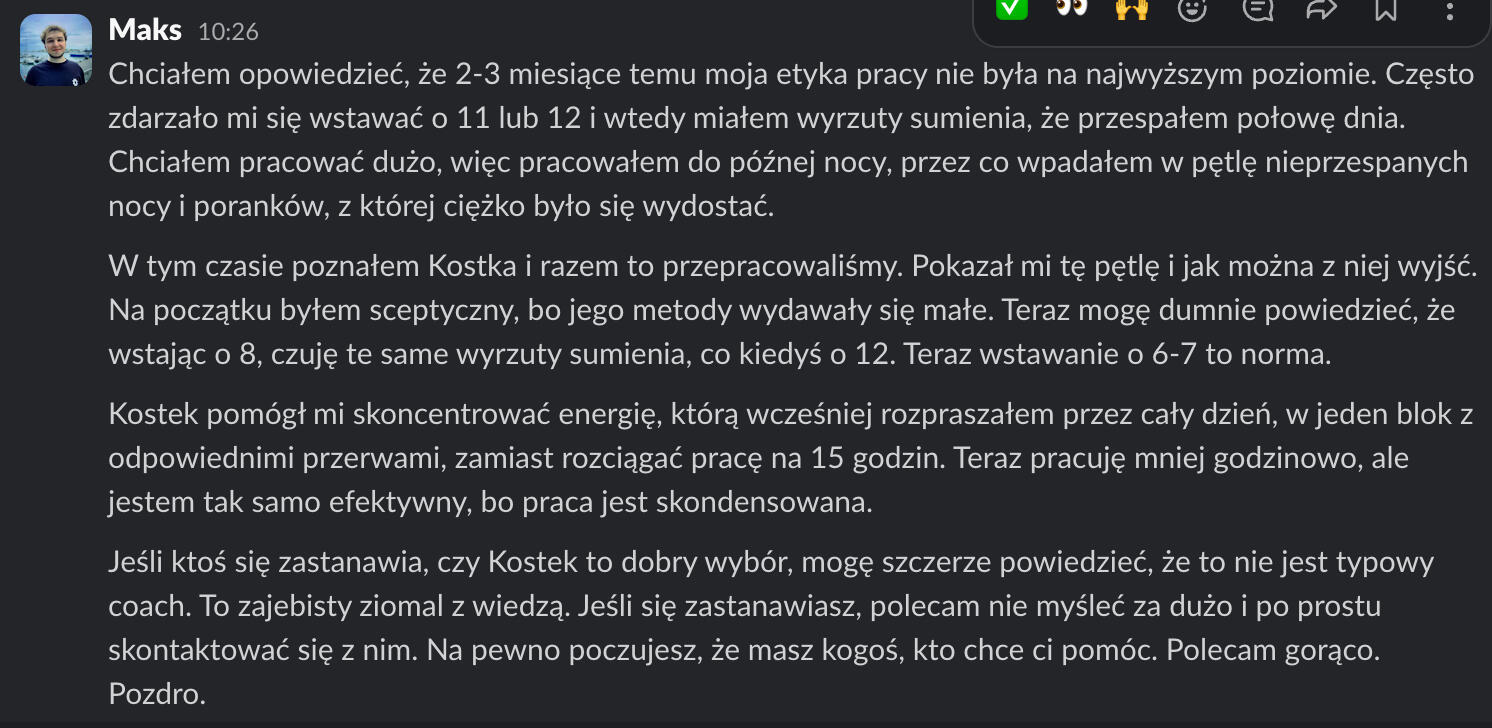 "Kostek pomógł mi poukładać pracę i rytm dobowy do tego stopnia, że znacząco podniosła się moja satysfakcja z pracy i poziom zarobków.Z całego serca polecam!"