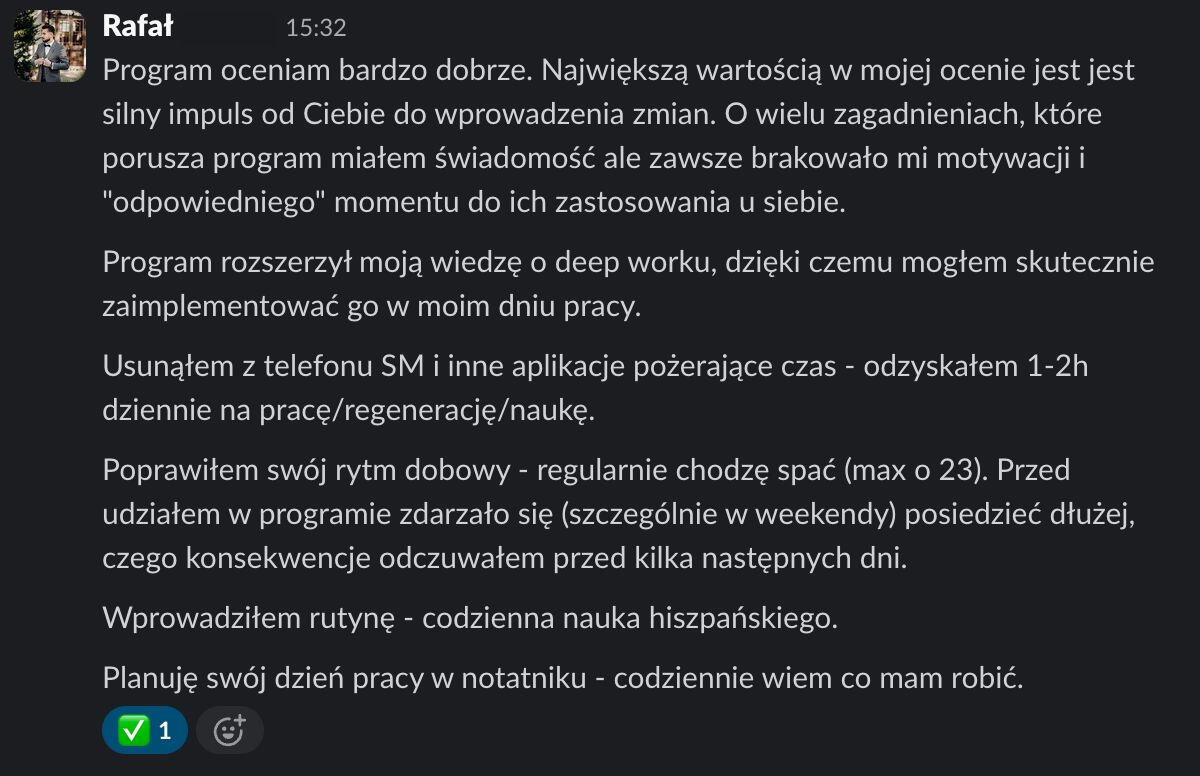 "Uporządkowałem swój dzień, poprawiłem nawyki i pracuję teraz w regularnych godzinach z dużo większą efektywnością.Zyskałem więcej pewności siebie, energii i lepiej radzę sobie z codziennymi wyzwaniami."